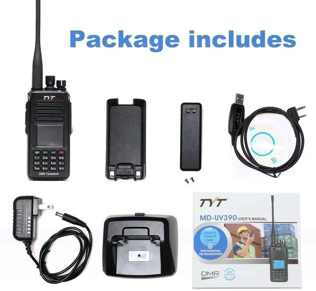 Package includes: TYT MD-UV390 GPS DMR Radio, 7.4 V 2800mAh Li-ion Battery Pack, Stubby 3 3/4" (10cm) & Whip 6 3/4" (17cm) Antenna, Belt Clip, Adapter, Desktop Charger, Driver & Software CD, Programming Cable, User Manual.