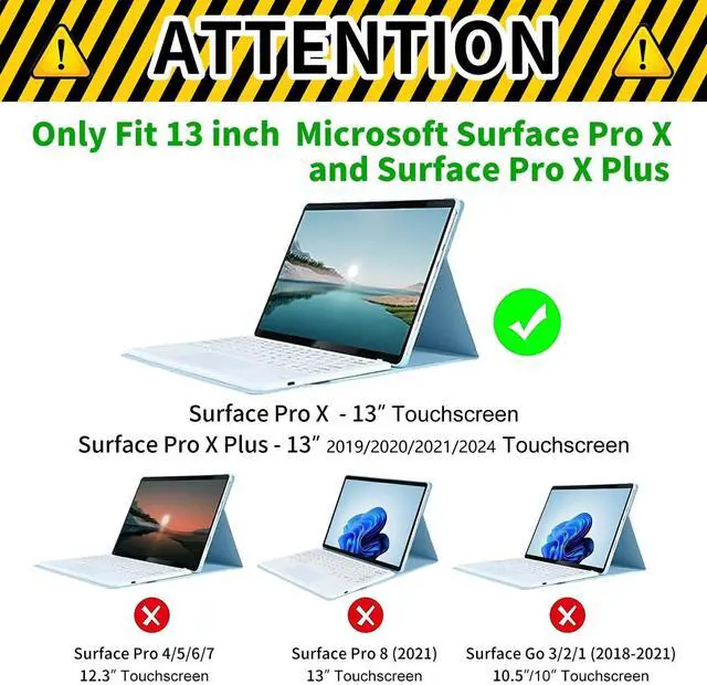 Only CompatibilityThis case is compatible with Microsoft surface pro x and pro x plus 13 inch 2019/2020/2021/2024 release, NOT compatible with any other models ^^ Auto Wake/SleepAutomatically wakes or puts tablet to sleep when the lid is opened and closed, wakes the tablet case up, saving power for longer reading time. ^^ Stable Stand DesignAdjustable stand offers a 60vedios viewing position and a 30typing position, satisfying your needs on your tablet. Free your hands for other entertainments. ^^ Premium Material It was made of premium PU leather exterior with soft TPU back and soft microfiber interior - Snug fit, lightweight and protective.