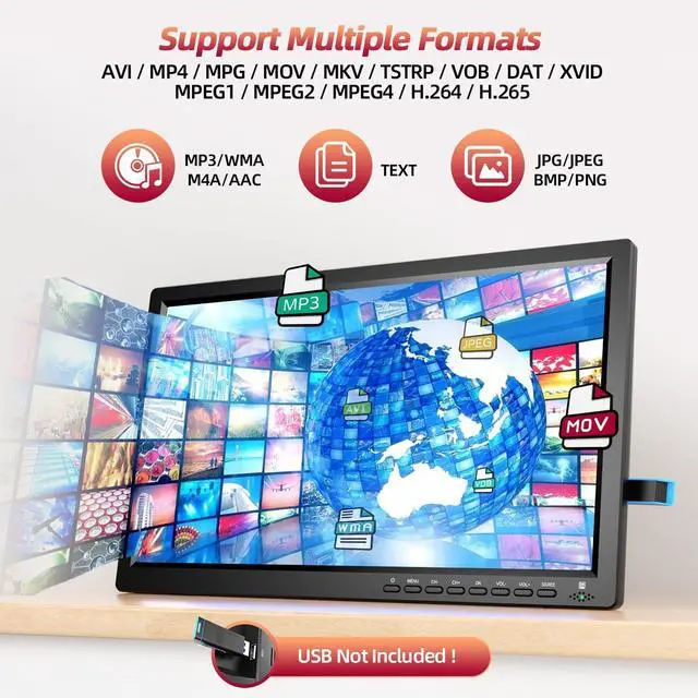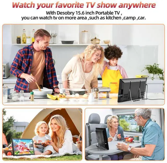 ^^ Compatible Multiple FormatsOur Mini TV Portable built-in USB Port, supports playing MP4, AVI, MPG, MOV, MKV, TS, TRP, VOB, DAT, MPEG 1, MPEG 2, MPEG 4, XVID, H. 264, H. 265, MP3, WMA, M4A, AAC, JPG, JPEG, BMP, PNG, TEXT ( max to 32GB FAT32). Take this portable TV and enjoy your favourie videos, musics, images and text in ease. ^^ Plug and PlayDESOBRY Portable TV easy to install, suitable for camping / emergency /outdoor travel / car travel / RV / tent / caravan / hiking / power outage / windstorm / kitchen, etc.
