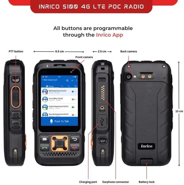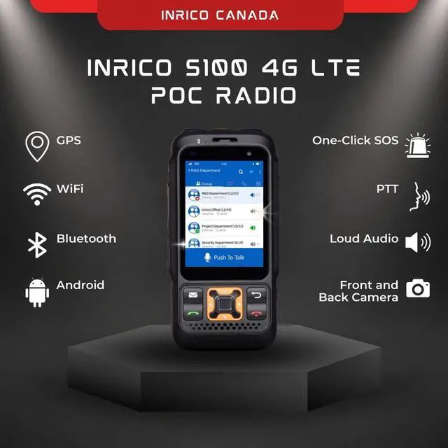 Inrico S100 4g POC radio with 2.8 inch touchscreen with exquisite network reach. This is a two way radio with up to 21 hours battery life at the operating cycle of 5/5/90. It supports GPS, Bluetooth, SOS, Android, etc. Works with Zello, RealPTT and other apps. However, to operate this radio with its full functionality (including programmable keys and SOS button, you need to get a subscription for the Inrico App. Reach out to us through inrico. ca to subscribe.