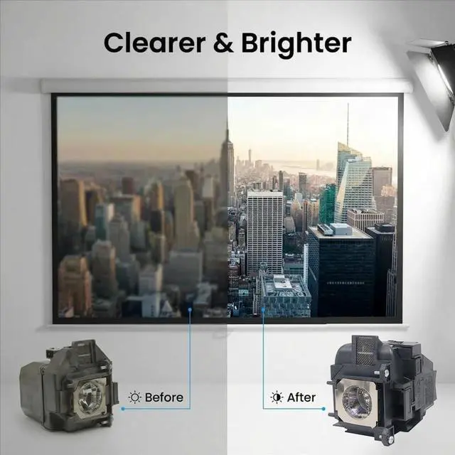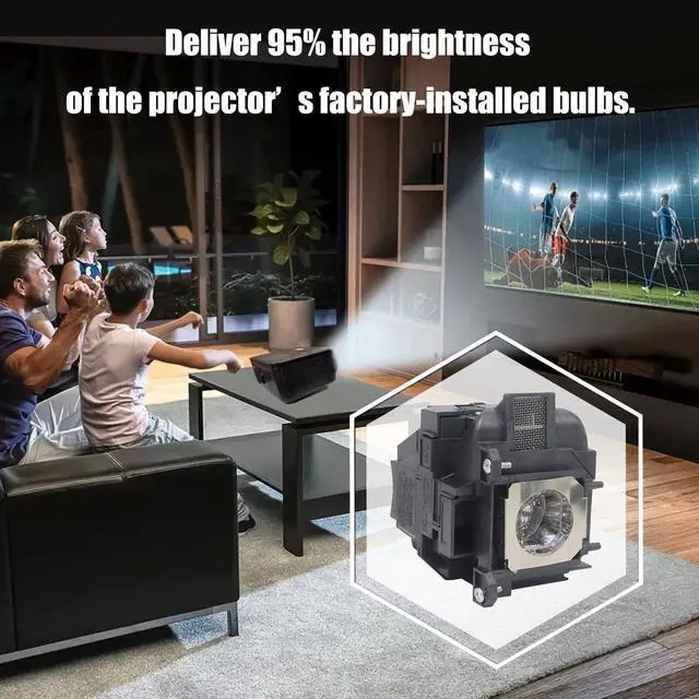 Compatible ModelsEX7240 EX3240 EX9200 VS240 H719A EB-U04 EB-X31 EH-TW5350 EX5240 EX5250 H692A H718A H682 H683 VS340 VS345 H764A H763A H730A H723A H722A H721A H720AEH-TW5350S EH-TW5300 EH-TW5210EB-X04 EB-W420 EB-W32 EB-W31 EB-W29 EB-W130 EB-W04 EB-U32 EB-U130 EB-S31 EB-S04, PowerLite Home Cinema 2040 /PowerLite Home Cinema 1040 /PowerLite Home Cinema 2045 740HD 640, PowerLite HC 2040 1040 740HD 2045 640 X27 W29 S27 1264 1224 99WH 98H 97H 965H 955WH 750HD ^^ 95% Original Brightness, Clear Projection Built with bulb cups and cores meeting original factory standards, this replacement projector lamp delivers up to 95% of the original brightness, providing clear and vivid images for home cinema, classrooms, and business presentations.