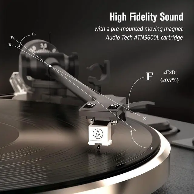 [All-in-1 Turntable for Vinyl Records] - 33 1/3 rpm and 45 rpm, come with the 45 RPM adaptor. Play other devices' music wirelessly by BT input or using the Aux-in port, and the built-in amplifier allows RCA connection to your own externally-powered speakers ^^ [Built-in BT Wireless Input Receiver] - Pair and play music from all your favorite devices iPhone and Android smartphones, tablets, PCs, usb-mp3 players through the turntable's speakers ^^ [Straight Tonearm with AT-3600L Stylus] - Adjustable counterweight work to balance aluminum tonearm and give the record players improved tracking, the AT-3600L stylus is designed to produce rich high quality audio sound ^^ [Belt-driven Stable Patter with Vintage Looking] - The aluminum die-cast platter with belt reduces vibration for increased clarity and hi-fi sound.