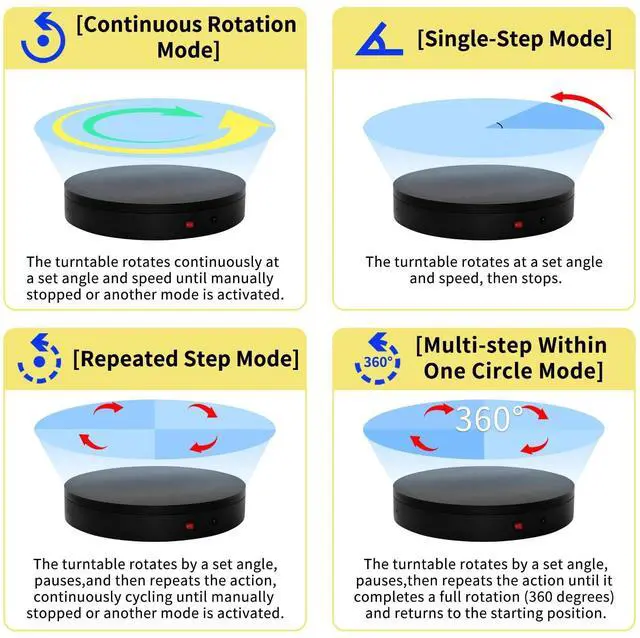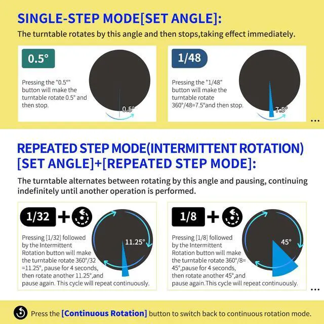 [Repeated Step Mode]: The turntable rotates by a set angle, pauses, and then repeats the action, continuously cycling until manually stopped or another mode is activated. [Multi-step