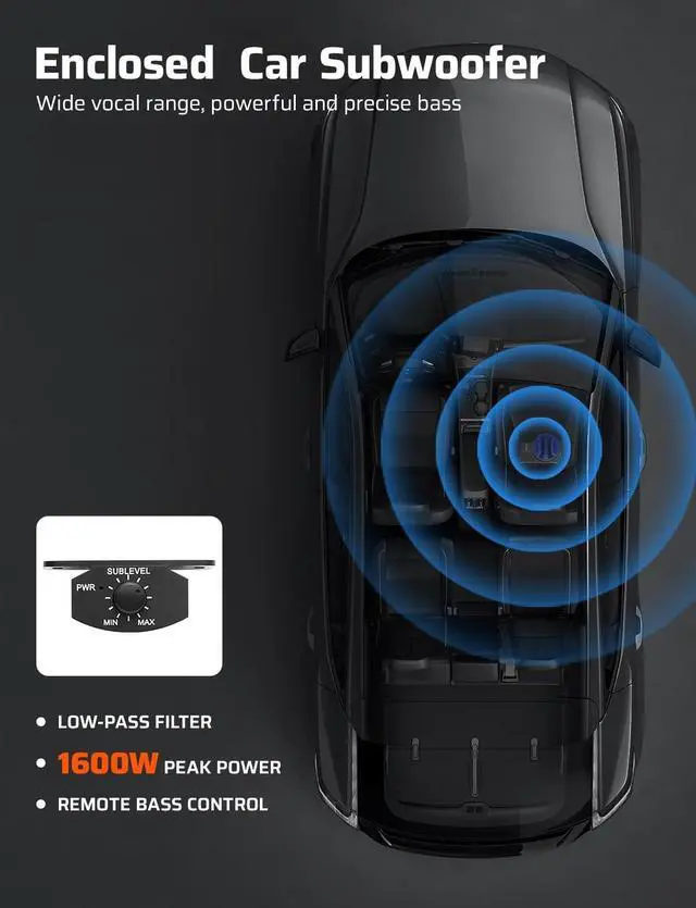 ^^ Full Control, Premium Connectivity & Detailed SpecsIndependent low-pass filter (35-150Hz), gain, and bass boost (0-12dB @20Hz). Wireless remote for bass adjustment. Includes gold-plated RCA cables, 90 angled connectors, and high-to-low level converter. REM wire for auto power-on.