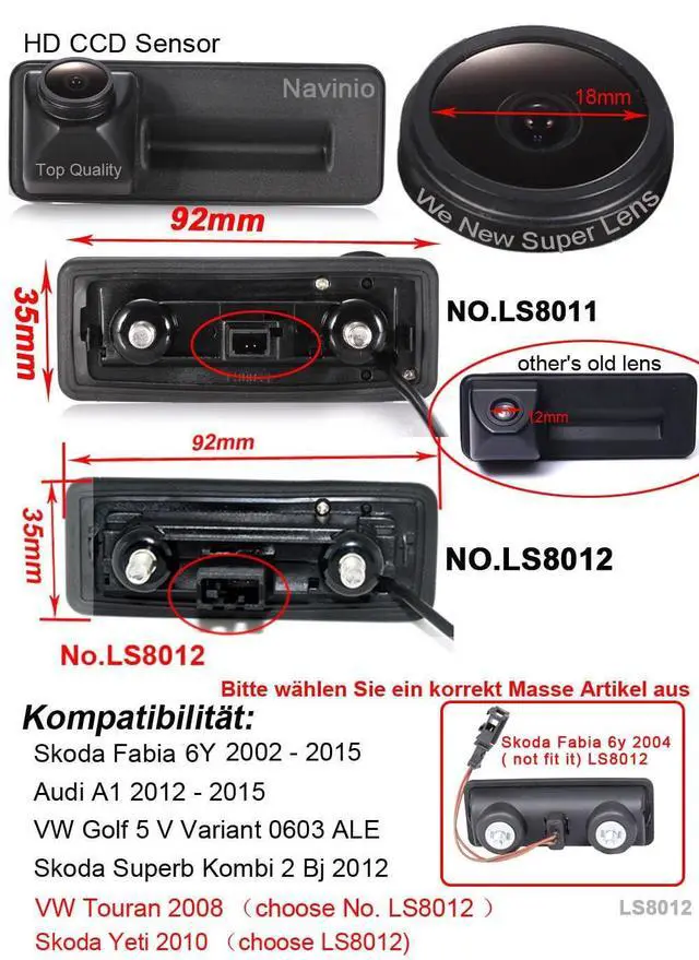 Dear customer, Please must check the camera size and appearance before place an order, see if can fit your car license plate lamp place size and appearance! Because the same car model in different countries may have some difference, please check the camera size and compare the installation of your car carefully to avoid mistake. This product could fit for all below models as expected: Replacement for Skoda Y6/Octavia limousine 2005; Octavia 1Z3 I Kombi combi 5e Bj 2013; Octavia 2 Fecelift Bj 2009 I Roomster 2010 - 2014; Octavia MK2 2010 2012 2013; Replacement for VW Touran 2008 ( choose No. LS8012); Replacement for Skoda Yeti 2010 ( choose LS8012) -