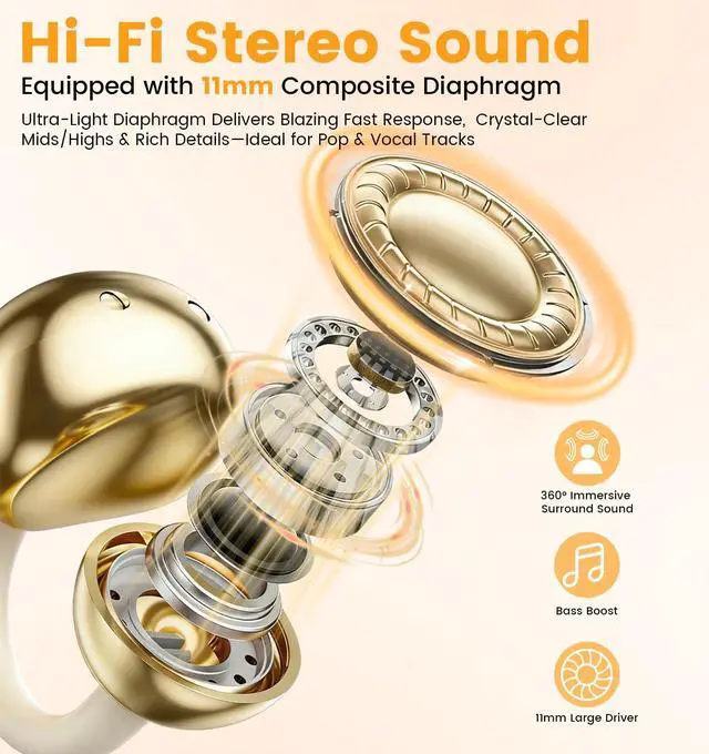 Bluetooth 6.0: Dive into stunning 3D sound with our exclusive ACSAVITY high-energy driver + 11mm Dynamic Driver, Jacuate wireless clip on earbuds paired with Panoramic Intelligent Algorithm. Bass gets a 58% boost and overall sound doubles in claritydelivering crisp, punchy, and truly immersive audio. Our wireless Bluetooth earbuds with the latest Bluetooth 6.0 chip ensure lightning-fast, ultra-stable, zero-latency streaming for seamless listening. ^^ Great Sound, Open-Ear
