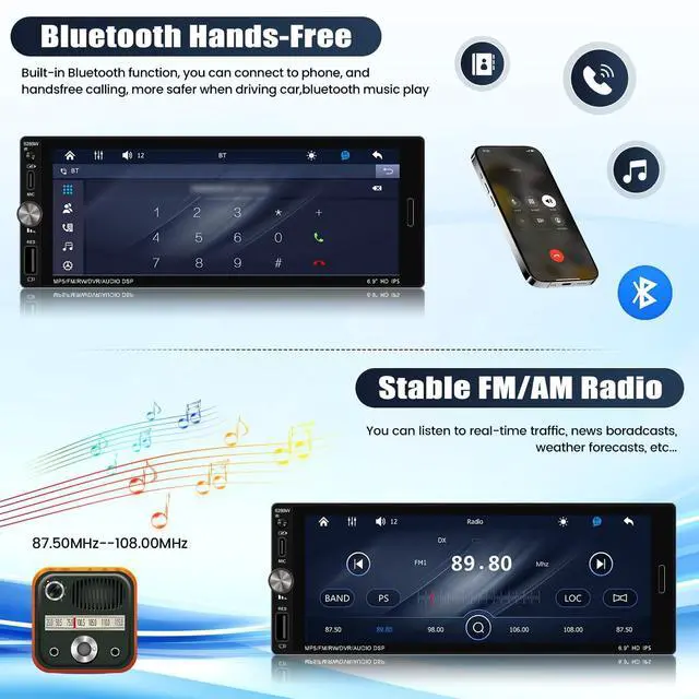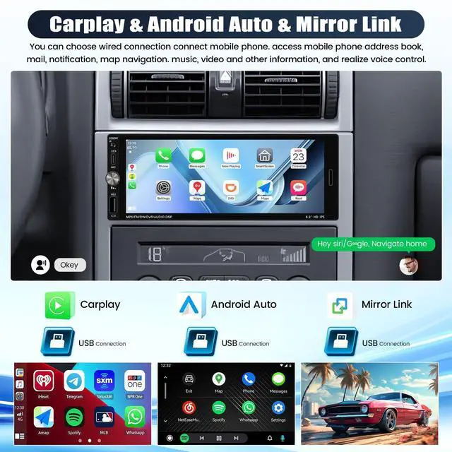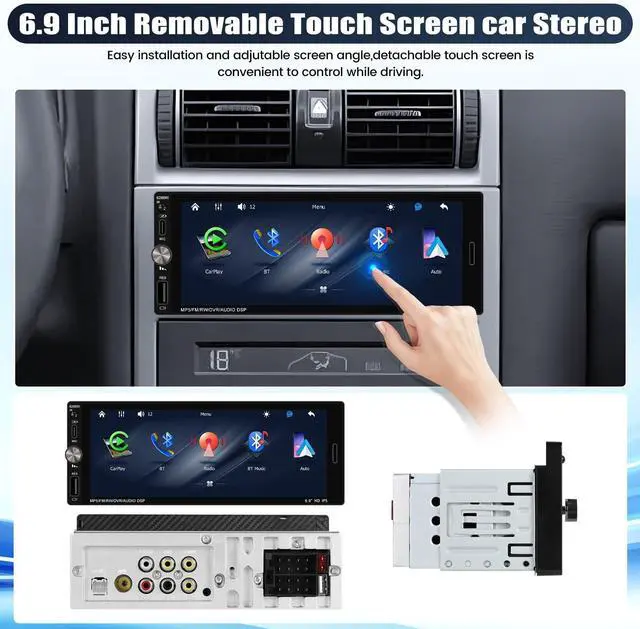 Installation size: 183*50 mm, universal for single din cars, can fit most vehicle ^^ Built-in Carplay& Android Auto&Mirror LinkThe single din touch screen car stereo support wireless CarPlay and Android Auto, providing seamless access to phone features such as music, navigation, calls, messages, and more. Additionally, Mirror Link allows you to project your phone's display onto the single din apple carplay stereo.