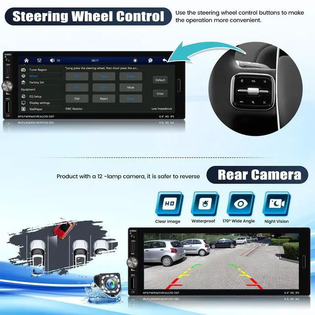 6.9 Inch Single Din Car Stereo1 din Touch screen car radio system can closely integrate the user's mobile phone and player, and access mobile phone address book, mail, map navigation, music, video and other information. 6.9 Inch HD digital 1280*480 capacitive LCD touchscreen car radio, with dynamic menu interface, builds in high quality stereo audio, with USB, UI color adjustable, SWC, rear camera input.