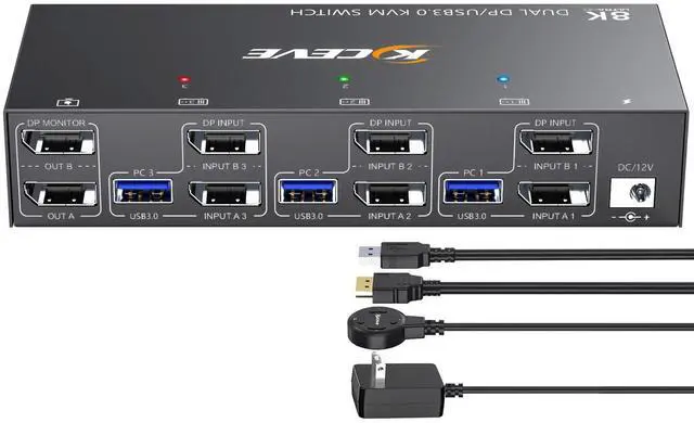 Tip for better results: Use high-quality 8K-rated cables to prevent flickering or blank screens and ensure signal stability ^^ High-Speed 5Gbps USB Hub & Streamlined SharingBeyond video, this KVM Switch 2 Monitors 3 Computers Displayport integrates a powerful USB 3.0 hub. Share up to 4 USB deviceslike keyboards, mice, and printersbetween all three computers without unplugging. With data transfer speeds up to 5Gbps (10x faster than USB 2.0 ), KVM 2 monitors 3 computers handles peripherals and file transfers efficiently, keeping your desk tidy and workflow smooth ^^ Effortless Operation with Two Switching MethodsTake instant command of your setup. Switch control between the three computers in seconds using either the button on the 3 computer KVM switch 2 monitors panel or the included 1.5 -meter wired remote controller. An LED indicator clearly shows the active source. The system is plug-and-play, requires no drivers. KVM 3 computers 2 monitors is powered by the included DC 12V adapter ^^ Broad Compatibility & Setup NotesThis versatile KVM Switch 2 Monitors 3 Computer is ideally matched with three desktop PCs. It is compatible with Windows, macOS, Linux, and Chrome OS.