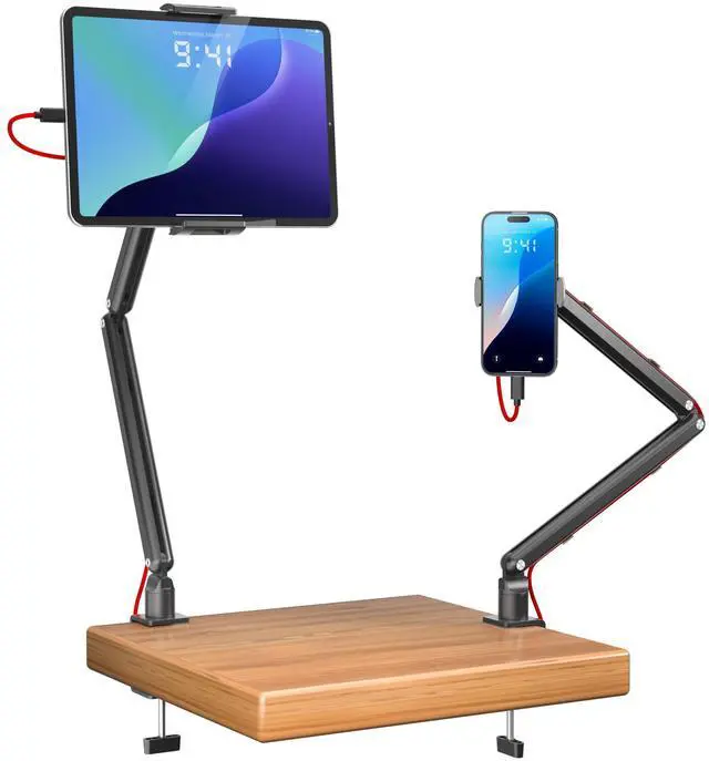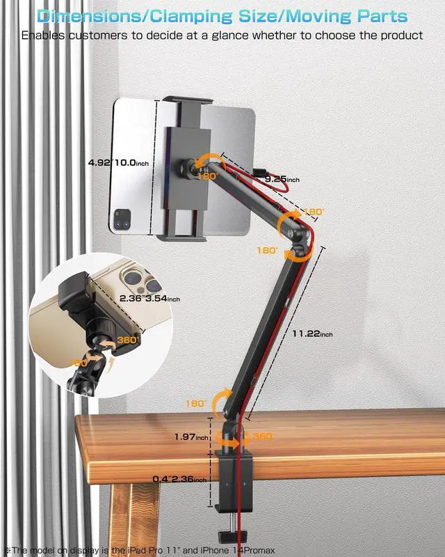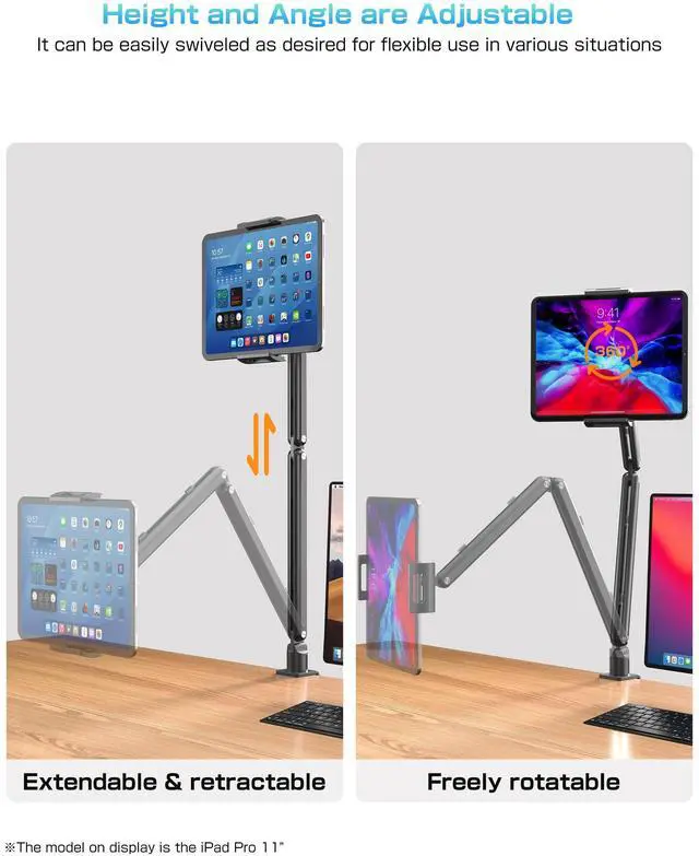 Wide range of motion -- This product features 7 joints, designed as a stand with an extensive range of motion, allowing you to adjust direction and height to your preference. Use it confidently even with extreme bending. Maximize desk space, position your tablet for optimal visibility, and boost work efficiency. Its foldable design ensures convenient storage when not in use. Additionally, it includes a smartphone holder for overhead photography. ^^ Exceptional Stability -- Based on feedback from previous customers, this arm stand features a hex wrench tightening mechanism to enhance load-bearing capacity.