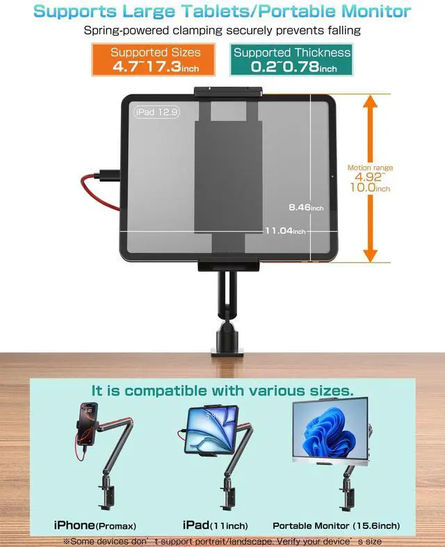 ^^ Wide Application -- Included with both mobile phone and large-screen holders, the large-screen clip holder section extends from 4.9 -10 inches to accommodate most mobile phones, tablets, and portable monitors from 4.7 - 17.3 inches. For 15.6 / 17.3 -inch portable monitors, please confirm the total width (including bezel) does not exceed 10 inches in width and 0.71 inches in thickness. ^^ Package including -- Arm stand X1, Cell phone clip X1, Large-screen display devices clip holder X1, Hex L-Key X1, User Manual X1.
