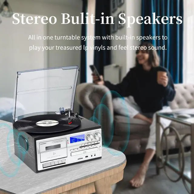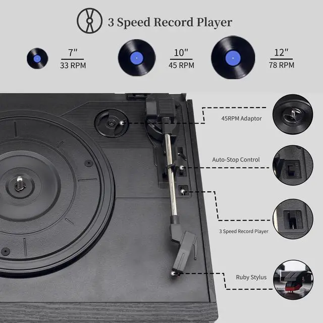 9 in 1 Multifunctional Record PlayerThis newest model turntable player supports various functions, including Vinyl records/Blutooth/USB/SD/CD/Cassette play, AM FM Radio, Cassette/USB/SD Playback and, Aux-in/RCA Line Out, Remote Control. ^^ Dual Powerful External SpeakersEquipped with a pair of external speakers 2x10W, let you enjoy the full, real and live vinyl audio in dual speakers easily. The volume is loud enough for many occasions. ^^ CD/Casstte/Vinyl-to-MP3 RecordingConverting Vinyl, Aux-in, CD, Cassette to USB/SD (MP3 Format) and Recording USB/SD, CD, Vinyl, Aux-in to Casstte directly. ^^ 3-Speed Belt Drive TurntableThe diamond-tipped stylus plays 7, 10 and 12-inch vinyl discs at speeds of 33 1/3, 45 and 78 RPM.