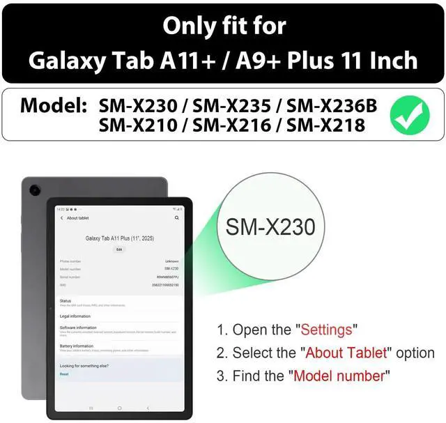 Compatibility: Only fit for Samsung Galaxy Tab A11+ Plus / A9+ Plus 11 inch 2026 / 2024 (Model: SM-X230/SM-X236/SM-X238; SM-X210/SM-X216/SM-X218); please confirm the model (SM-X***) before purchase.