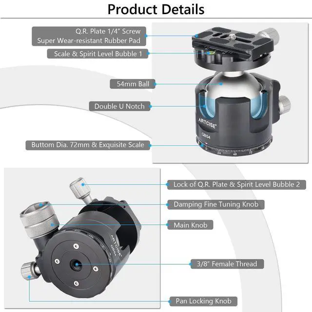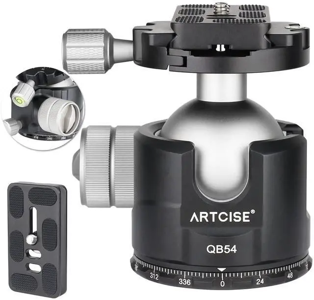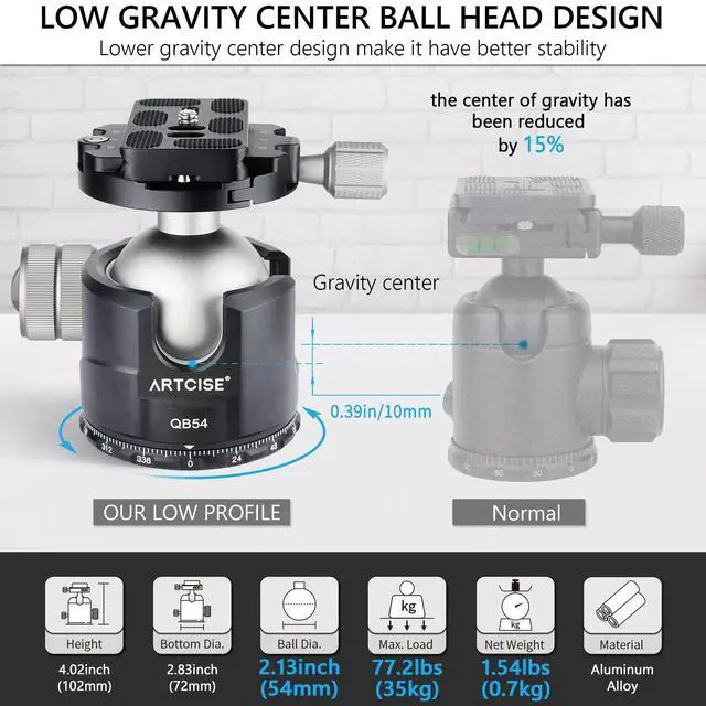 4 BRIGHT POINTS TO CREATE ARTCISE LOW PROFILE BALL HEAD QB54: Unique super large 54mm diameter ball design Low gravity center ball head design make it have better stability Superior Aluminum-Alloy+CNC Precision Finishing& Anodized Surface 77.2 lbs/35kg Loading Capacity& damping adjustment main knob ^^ 54MM LOW PROFILE BALL HEAD IS THE KING OF TRIPOD BALL HEAD CATEGORY: the biggest ball diameter of ball-head is 52mm, but Richard, the chief designer of our ARTCISE brand broke this limit and adopted 54mm super big ball, the ultimate ball diameter gives it ultimate bearing capacity and stability. Best match40MM CARBON TRIPOD AS95C ^^ LOW GRAVITY CENTER BALL HEAD DESIGN: Its locking structure has been moved to the side of the tripod ball head, the center of gravity has been reduced by 15%, the design made it has better stability.