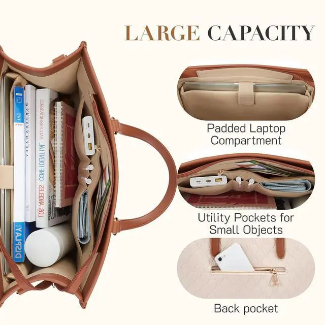 ^^ Durable & Water-resistant: Crafted from water-resistant and scratch-resistant PU leather, equipped with premium gold hardware and detailed streamlined stitching on the computer bag, add to the durability of this women's laptop bag.