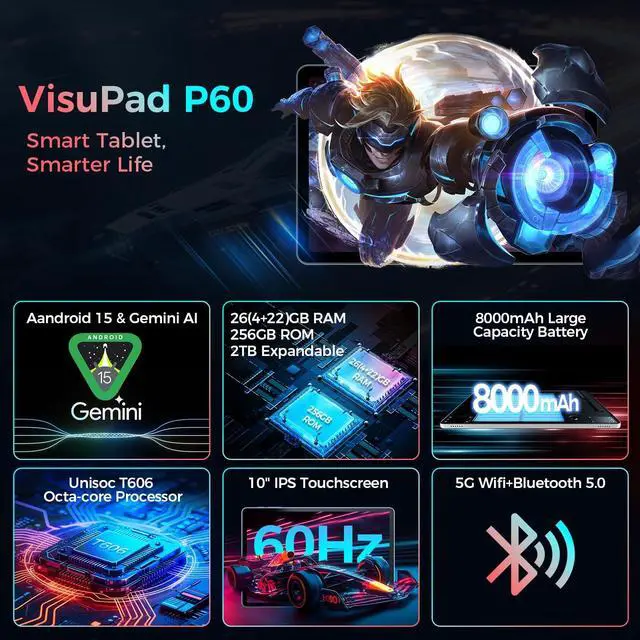 2026 Tablet with 26GB RAM + 256GB ROMThe tablet comes with 26GB RAM (4GB physical + 22GB virtual) and 256GB ROM, which effortlessly handles dozens of open tabs, games, and apps simultaneously. Android tablet also supports expansion up to 2TB via a MicroSD card (not included), with sufficient capacity to store a large number of photos, videos and large files AT17 ^^ Android 15 OS + Gemini AITablet with keyboard is powered by the latest Android 15 system, offering enhanced privacy controls, customisation and user-friendly AI-driven operations. Android 15 tablet feature Gemini AI, which can efficiently extract information from complex documents, answer queries, and provide other convenient services AU13 ^^ Octa-core Processor + GMS CertificationThe Android tablet 10 inch is equipped with a powerful 8-core Unisoc T606 processor, which effortlessly handles everyday multitasking with efficiency, ensuring smooth operation without lag.