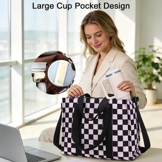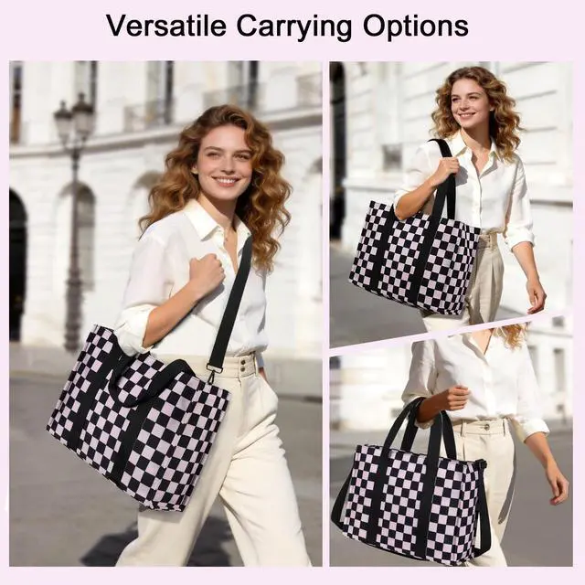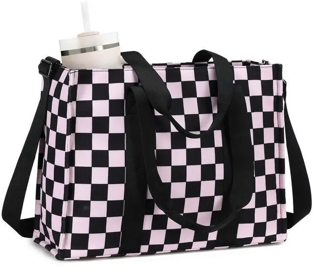 Laptop Tote Bag for Women Work 15.6 inch Canvas Shoulder Bags Computer Messenger Purse Teacher Handbag Office Briefcase (Blck-Pink Checkered)