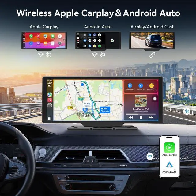 Wireless Mirroring: This portable carplay screen with 10inch IPS touchscreen (1600600 resolution) supports AirPlay/Miracast for smartphone mirroring. Our upgraded android auto screen for car has High-sensitivity controls, vivid colors, and anti-glare display ensure clarity indoors and outdoors. ^^ Dual Bluetooth 5.0