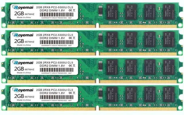 DDR2 8GB 667MHz UDIMM Desktop RAM PC2-5300, DDR2 667MHz, Unbuffered, Dual Rank, Non ECC, 2Rx8, 240-Pin, CL5, 1.8V memoria ram, apply for Desktop AMD, Intel, Mac system ^^ Advanced ChipsAll DDR2 4x2GB ram are from Samsung IC / Original and high quality ram memory module. Professional company, high-quality materials, more guaranteed product quality ^^ Stable and Durable2GB DDR2-667MHz Udimm, 100% tested for stability, durability and compatibility. We test all rams before shipment to ensure this PC2-5300 ram works stably and normally ^^ Increases System PerformancePC2 4x2GB ram will speed up loading times, improve system responsiveness, and increase your system's ability to handle greater workloads.