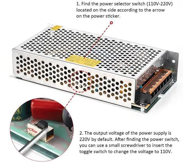 Output: 5V DC up to 30 Amps Max; The output voltage can be regulated by 10%, from 4.5V to 5.5V, Works with device that draws less than 30A, such as DC5V1A~30A. ^^ The default input voltage is 220V, 110V/220V must be selected by switch before using to avoid damaging. Please replace the switch with the voltage appropriate for your project. High-quality raw materials, porous metal shell, good heat dissipation performance, small size, strong performance stability, only support indoor use. ^^ Make sure your device match the 5V voltage and wattage less than 150W. Please dont run it overload. The max use should be no more than 80% of the full loads, otherwise, Its cause the power supply to overheat, the service life of the power supply will be greatly shortened. We recommend you to use this 5V30A 150W power supply to power devices less than 120W.