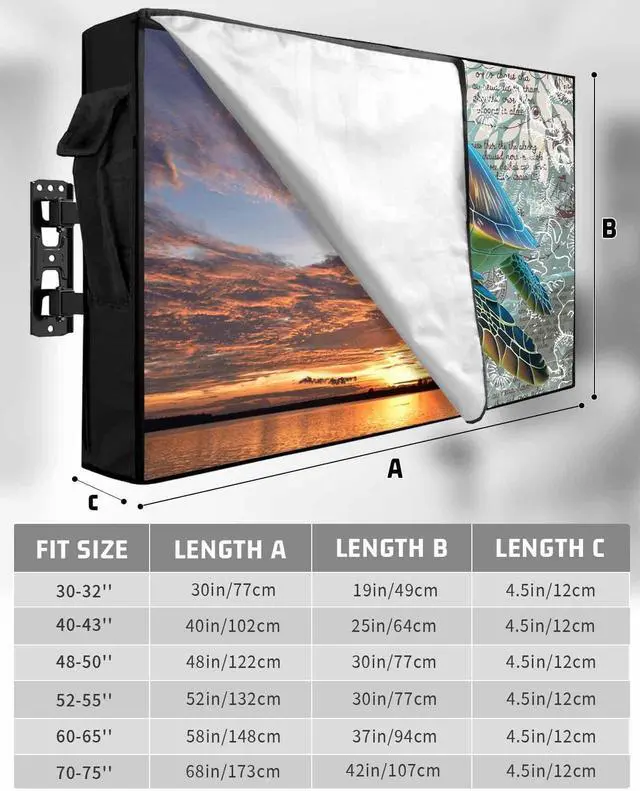 Outdoor TV Cover Size Chart 30-32in /30x19x 4.5 in32 in smart tv 40-43in /40x25x 4.5 in43 inch smart tv 48-50in /48x30x 4.5 in50 inch tv 52-55in /52x30x 4.5 in55 inch tv 60-65in /58x37x 4.5 in65 inch tv 70-75in /68x42x 4.5 in75 inch tv Outdoor TV Protector Design Full coverage design avoids damage from the nature elements, makes your outside television always look like new. Warm Tips Please measure the size of your TV accurately before purchasing a TV cover. Store the remote in the cover pocket. When youre ready to switch off and head indoors, always remember to place the remote inside its pocket on your outdoor TV cover.