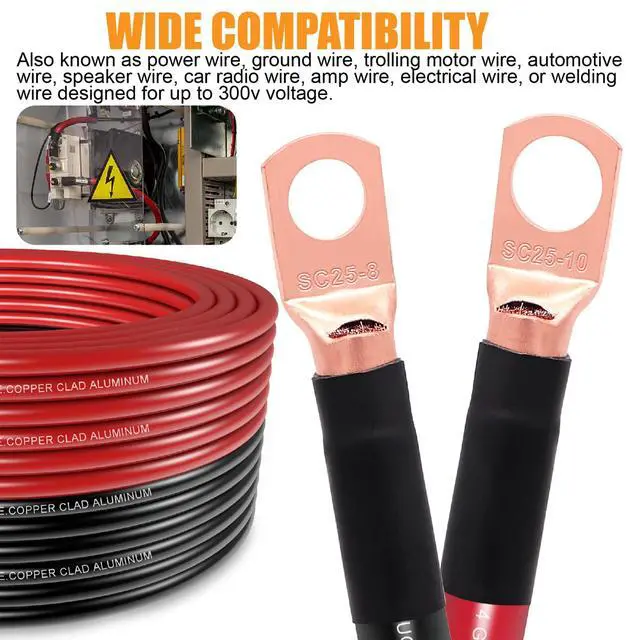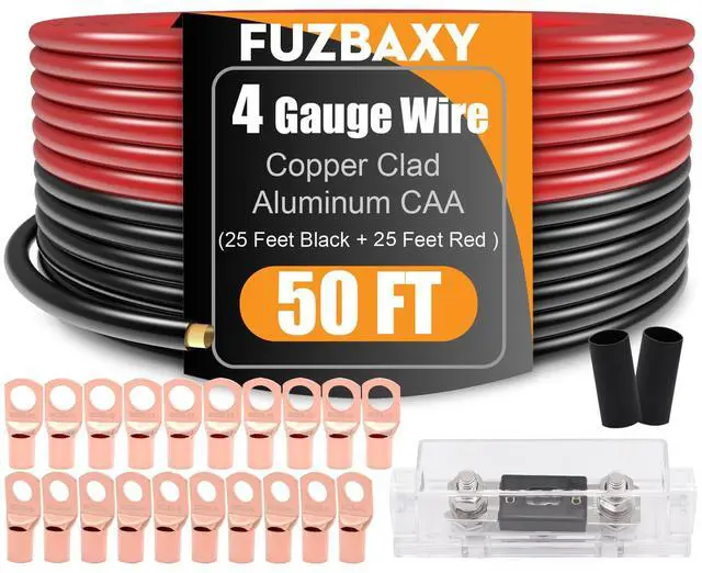 COPPER CLAD ALUMINUM (CCA) Copper coated aluminum wires the most economical choice for choosing a power supply or ground wire, uncompromised quality at an economical price. ^^ Fuzbaxy 4 Gauge Wire (25 Feet Black+25 Feet Red) Copper Clad Aluminum CCA - Primary Automotive Wire Power/Ground, 20PCS Lugs Terminal Connectors, 20PCS Heat Shrink Tubing with 100A ANL Fuse ^^