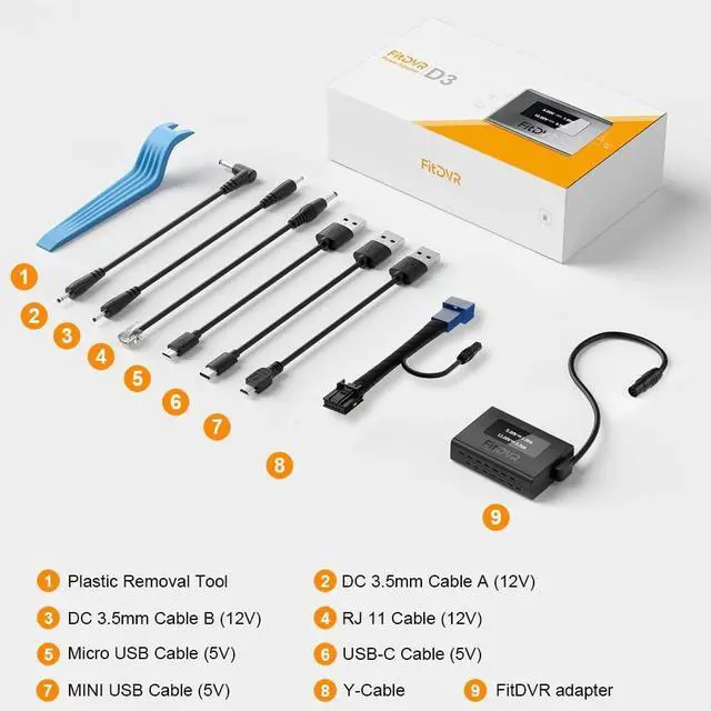 Vehicle CompatibilityCompatible with Hyundai Tucson, Santa Cruz, Kona, Kia Sorento, Sportage 2022-2025, etc. Please confirm whether the car has Lane keeping Assist plug (12-PIN) before purchasing. ^^ Dual Voltage OutputInput voltage is 12V, with output options of 5V (USB cable) and 12V (DC 3.5 mm cable). ^^ 6 Output Cables IncludedIncludes Mini USB (5V) x1, Micro USB (5V) x1, USB-C (5V) x1, RJ11 (12V) x1 and DC 3.5 mm (12V) cable x2. ^^ LED DisplayThe FitDVR adapter features an LED screen that displays current and voltage, a unique feature compared to other brands.