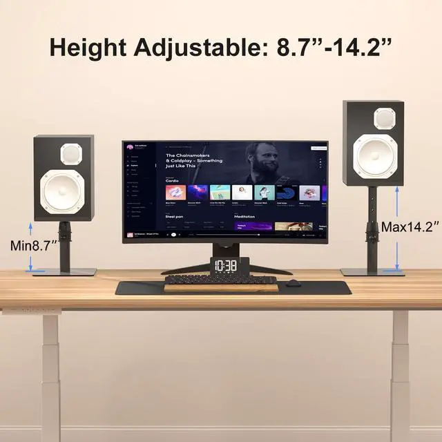 Universal - 9.6 x 8.8 platform with height-adjustable stand. Load up to 33lbs each stand. ^^ Adjustable - raise your speaker to eye level with 4-level locking pole ( 8.7 / 10.5 / 12.4 / 14.2 to the desk). Then adjust the tray to the ideal projection angle with +12 to -12 tilting capability. ^^ Stable - high-grade steel construction securely holds studio monitor speakers. Stable free standing base can move anywhere. ^^ Space-saving - raise your speaker to get the best sound from your monitor spears and you can also elevate laptop, projector, CD player and other devices to save more desk space.