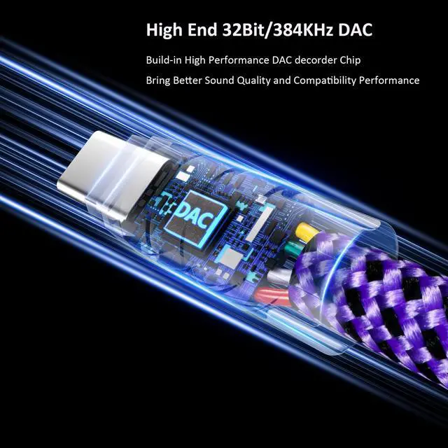 Hi-Fi Sound QualityThe Type C to 3.5 mm aux cable uses a high end taiwan imported 32-bit/384kHZ DAC decoding chip(Ordinary products use 16-bit decoding chips), for audiophile, it's very important, This means lower loss of sound quality. For ordinary users who are not very sensitive to music, there is little difference. ^^ Multi-function DongleThis Veimeitk USB C to 3.5 mm aux cable cord can easily connect your Type C devices to car stereo, home stereo, speaker, headphones or any device with standard 3.5 mm audio jack or Aux-in port and offers you the freedom of listening to music ^^ Professional-Grade DurabilityHeavy Duty, Strong and Rugged Cable, Reinforced cotton braiding+ multi-layer shielding design, Outer diameter of cable up 6.2 mm.