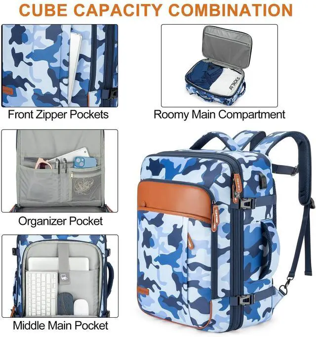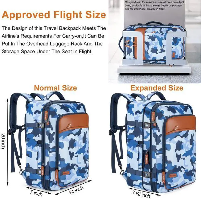 LARGE CAPACITY AND EXPANDABLEThis suitcase backpack for travel features zipper expansion, which can expand up to 42L for 3~7 days of travel essentials. The spacious main compartment with straps to secure travel supplies, one separate laptop compartment for a 17-inch laptop, and a hidden anti-theft pocket on the back protect your valuable items. It's perfect for travel, business, camping, or cruises with a 20*14*7" size. Please check the size before purchasing. ^^ FLIGHT APPROVED CARRY ON BACKPACKThis laptop backpack for men is designed for travel, you can travel anywhere you want, and two padded handles for easy switching between backpack and suitcase.
