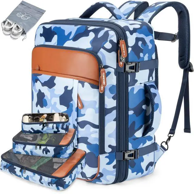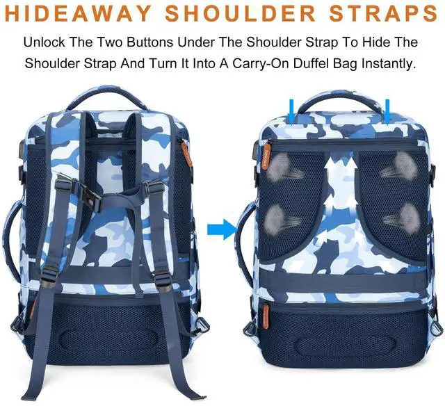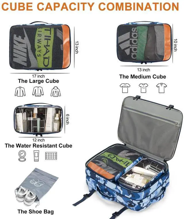 ^^ HIDDEN SHOULDER STRAPS & BREATHABLE SPONGE The Breathable sponge mesh design on the laptop backpack for men and padded shoulder straps help with air convection, ventilation, and heat elimination, also it help relieve the stress from your shoulder. This luggage backpack is crafted with hideaway padded shoulder straps which can be hidden away in the zippered back panel when not using. ^^ 3 PACKING CUBES + 1 SHOE POCKETLarge cube for sweaters, jackets, and pants. Medium cube for shirts, and shorts. Small cube with a transparent side for providing a clear overview of toiletries.