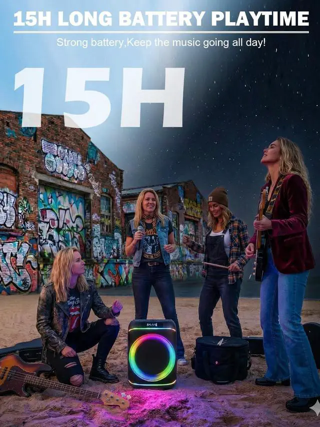 Bring big sound wherever your adventure takes you! ^^ [Dynamic LED Light Show That Moves with the Music]Light up the night! The built-in LED party lights pulse and change color with the beat, creating a vibrant visual experience that matches your music. Choose from multiple light modes strobe, fade, or rhythm sync and watch your party big speaker become the centerpiece of every event. ^^ [Multiple Connectivity Options USB+ AUX]Seamlessly connect your devices! With for ultra-stable streaming up to 100 feet, you can connect smartphones, tablets, or laptops with ease.