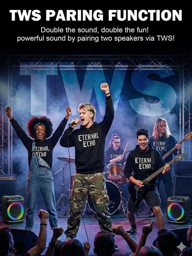 Prefer wired playback? Plug in via the AUX input to TV, computers, or MP3 players. Its a versatile outdoor speakers for every setup. ^^ [TWS Pairing for 160W Surround Sound]Double the sound, double the fun! Activate True Wireless Stereo (TWS) mode to pair two speakers and create a 160W stereo system. Perfect for large gatherings, outdoor parties, and karaoke nights. Use the Includes controller included to switch tracks, adjust EQ, and control lights from across the room total freedom in your hands.