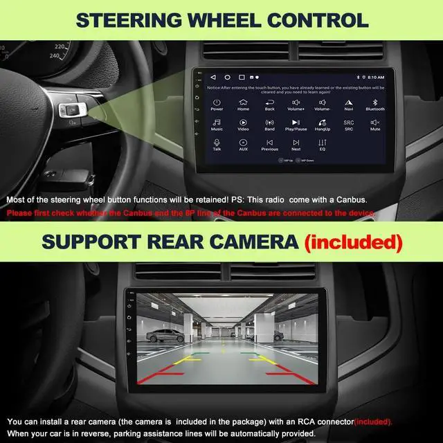 Camera Backup Assistance: Shift into reverse for a crystal-clear view behind you! Simply connect the included high-definition AHD 720P/CVBS rearview camera to the dedicated RCA port. When you shift into reverse, the screen will automatically display the live video feed with dynamic guidance lines for precise parking.