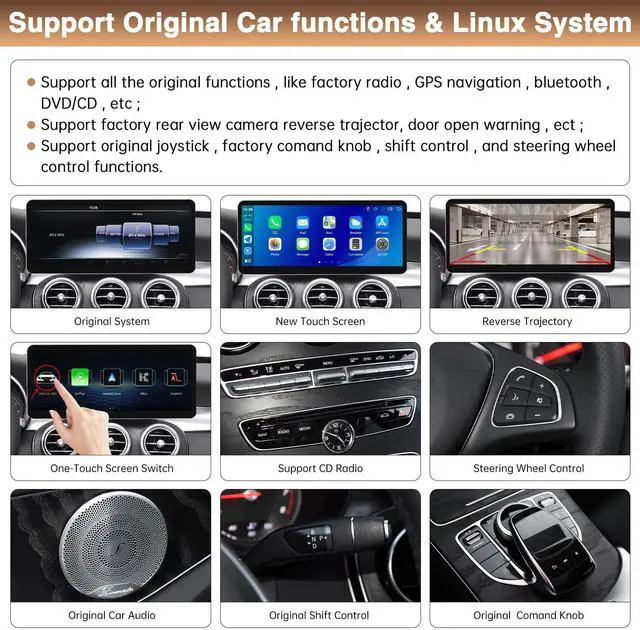 Pre-shopping NotesThe car touch screen for Mercedes-Benz C Class W205 GLC V Class W447 2015-2019 NTG 5.0 System. Pls Confirm the system and car model to buy!!! If you are unsure, pls ask for help from us. ^^ 12.3 Inch 1920*720P Touch Screen Display With the IPS display touch screen, high-resolution image quality. The HD display delivers outstanding clarity, contrast, and brightness. Catch every single sharp, vivid, and vibrant picture from virtually any vantage point; It supports AHD 720P/CVBS NTSC/PAL camera. ^^ Car Touch Screen Built-in Wireless/Wired CarPlay and Android AutoUse your phone in safety while you drive.
