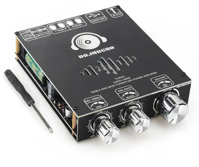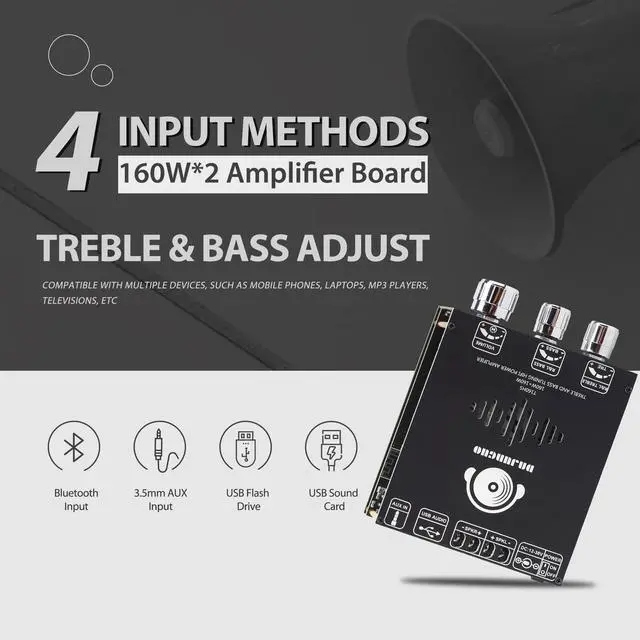 Multiple input methodsThe T160HS has multiple input methods such as Bluetooth input/ 3.5 mm AUX input/USB input, and is compatible with most audio devices such as mobile phones, computers, and televisions. ^^ TDA7498E ChipThe TDA7498E chip adopts advanced digital audio processing technology, maintaining a relatively low level of distortion in audio output, thereby delivering high-quality audio amplification, Wide