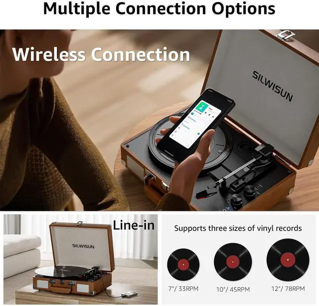 Complete Connectivity: Enjoy wireless bluetooth, aux in, headphone jack, and rca output integrated into one retro journey vinyl player ^^ Smooth 3-Speed