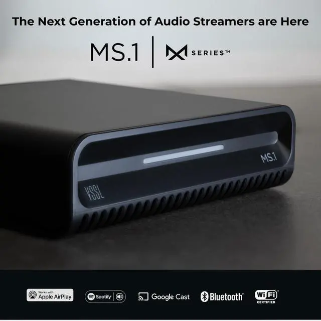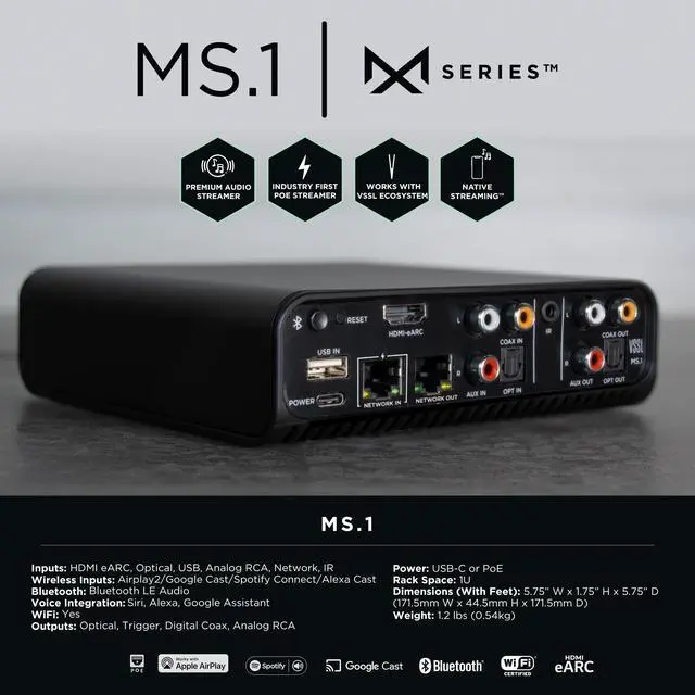 1 provides premium connectivity for TVs, receivers, amps, and multi-room setups. ^^ VSSL's First PoE Audio Streamer The MS. 1 is the first ever PoE Streamer offered by VSSL, delivering unmatched flexibility and clean installation in professional and smart home audio systems. ^^ Compact & Rack-Mountable Design Measuring just 5.75 x 1.75 x 5.75 and weighing only 1.2 lbs, the MS. 1 fits in a 1U rack space or can be placed anywhere for discreet, high-performance audio streaming. ^^ Part of the VSSL MX Series Ecosystem Seamlessly connects to other VSSL devices through the VSSL CNCT app, enabling whole-home audio control and synchronized playback across multiple zones.