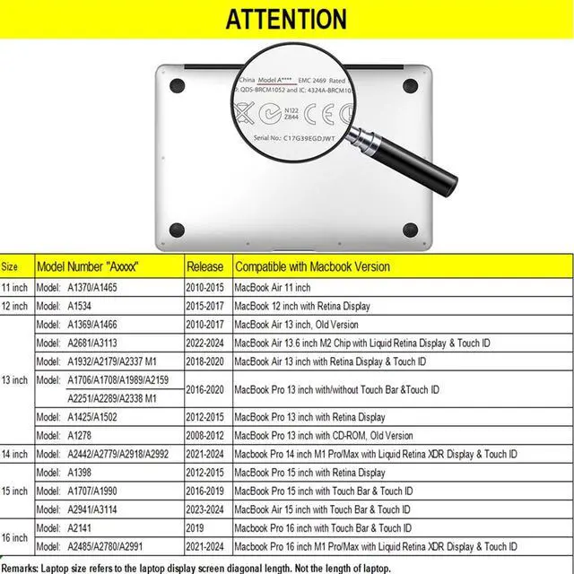 2016-2020)Note: Please kindly check the model number "AXXXX" on the bottom of your MacBook before purchaseNot compatible with models: 1. Model A1369/A1466 (Macbook Air 13"/ 13.3", Old version, Release 2010-2017)2. Model A1932/A2179/A2337 M1(new Macbook Air 13"/ 13.3" with retina display and touch id, Release 2018-2020)3. Model A2681 M2/A3113 M3(new Macbook Air 13.6" with touch id, Release 2022/2024)4. Model A1425/A1502 (Macbook Pro 13"/ 13.3" with retina display, release 2012-2015)5. Model A1278 (Old version, Macbook pro 13"/ 13.3" with CD-ROM, Release 2008-2012)Package