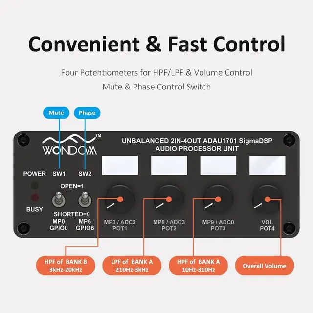 Powered by ADAU1701 DSP, 28/56bit Digital Signal Processor Engine ^^ Unbalanced 2-In, 4-Out Preamp Unit ^^ Four Potentiometers for HPF/LPF Filter & Volume Control ^^ Supporting SigmaStudio Programming after Connection with ICP5 ^^ Open-sourced Demo Program & HEX Files for Restoring Factory Settings Provided