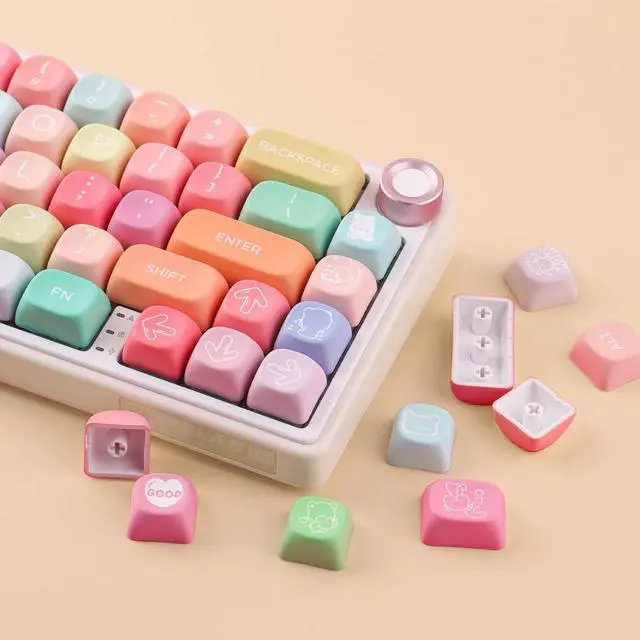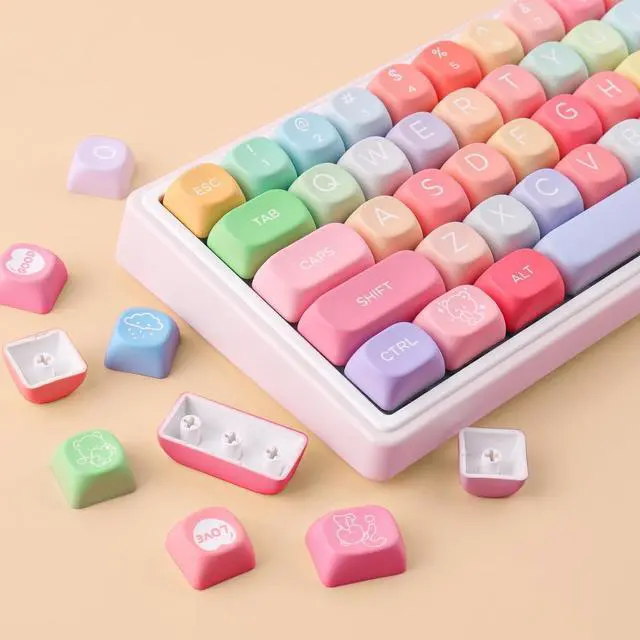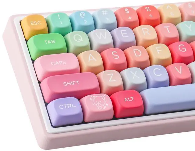Rainbow-Themed MOA KeycapsThis keycap design style is inspired by the colorful rainbow, and then the cute bear cartoon image as the pattern, looks very much like one after another rainbow candy, very interesting design can bring you a pleasant using experience ^^