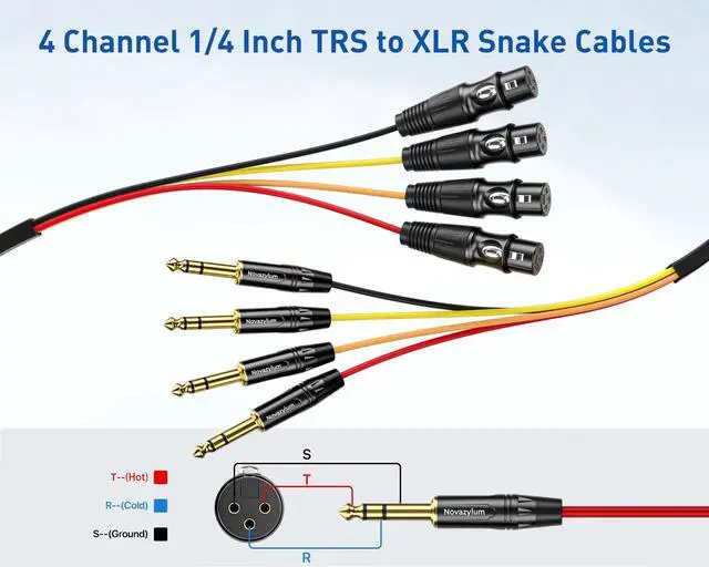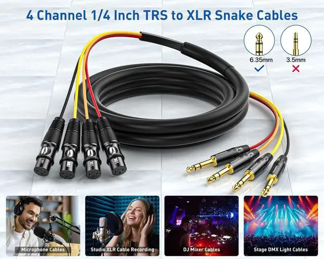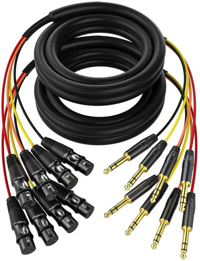 [Upgraded 4-Channel Design]Professional 4-channel XLR to 1/4 TRS snake cable carries multiple balanced signals through one cable, reducing clutter and saving space. Ideal for studio, stage, or live sound setups. ^^ [Noise-Free Audio Performance]24AWG oxygen-free copper conductors with foil and braided shielding minimize EMI and RFI interference, delivering clear, high-fidelity sound for professional recording and mixing. ^^ [Durable & Flexible Build]Features color-coded xlr cables for easy identification. The soft yet tough PVC jacket resists wear, bending, and pulling, ensuring long-lasting reliability in daily use. ^^ [Wide Compatibility]Connects multiple audio sources to mixers, monitors, synthesizers, or interfaces.