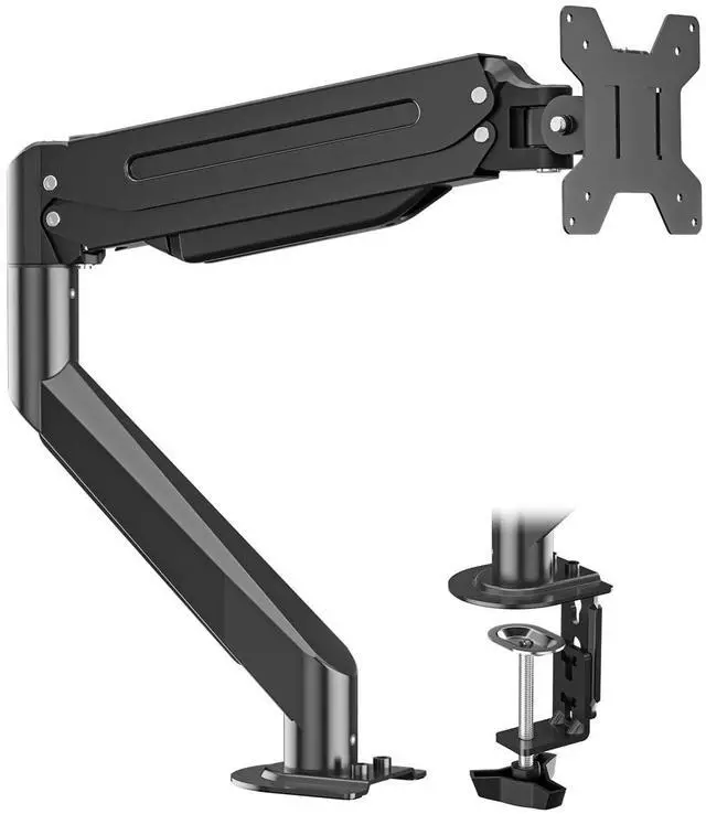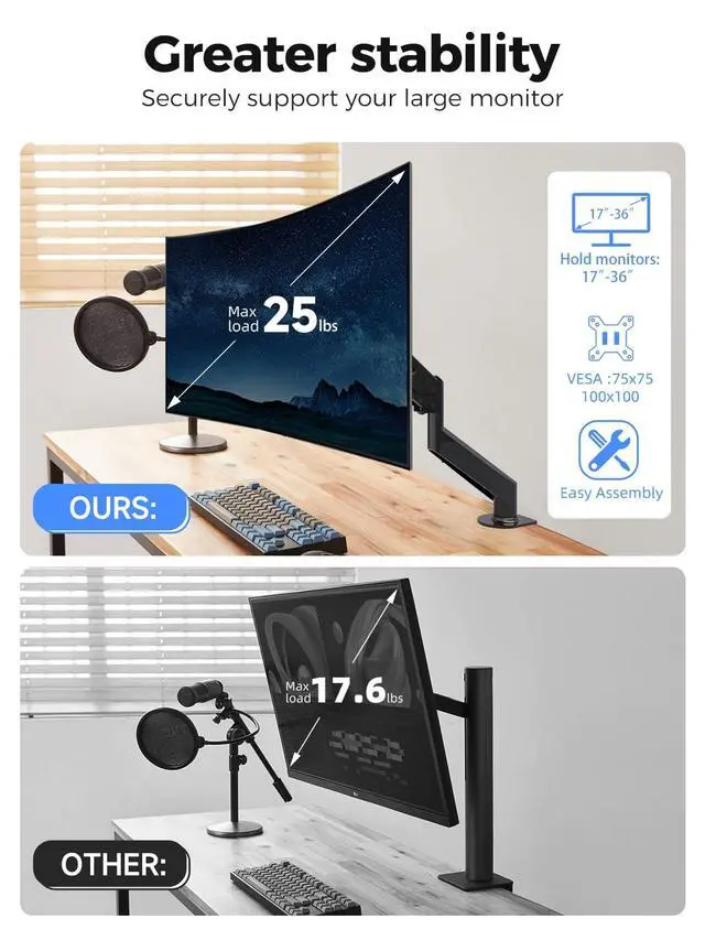 Universal compatibility & robust support Engineered for both productivity and gaming setups, this heavy-duty gas spring arm is compatible with most monitors ranging from 17 to 36 inches. With a robust 25lbs weight capacity, it securely holds even ultra-wide curved screens. The mount fits all standard VESA patterns (75x75mm & 100x100mm), ensuring a perfect fit for your specific display. ^^ Flexible viewing angles for maximum comfort Experience complete ergonomic freedom. The advanced head mechanism allows for 360 rotation, letting you instantly switch between landscape and portrait modeperfect for coding, document review, or social media management.