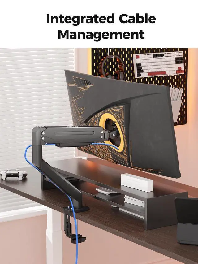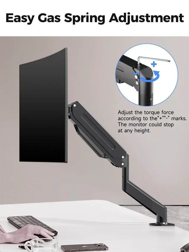 Note for grommet installation: Requires a hole diameter larger than 42mm in your desktop. ^^ Premium all-metal construction Stability is key to productivity. Crafted from high-strength metal with a lightweight aluminum alloy lower arm, this mount eliminates annoying monitor wobble while you type or game. The premium matte finish and streamlined design not only look great in a modern office or RGB gaming room but also free up valuable desk space for your keyboard, books, or a cup of coffee. ^^ Easy installation & cable management Say goodbye to complicated setups. We include a detailed instruction manual and a complete kit with all necessary mounting hardware (screws, hex tools, and spacers) to get your monitor mounted in 20 minutes. The built-in cable management clips run through the arm, hiding unsightly wires and keeping your desk looking clean and professional.
