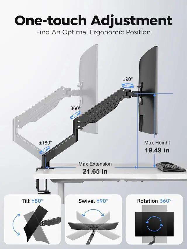 Tilt your screen forward/backward (+80 to -80) to eliminate glare, and swivel left/right (+90 to -90) to share your screen with colleagues effortlessly. ^^ Dual table installation options. We understand that every desk is different. This mount offers versatile installation methods to suit your workspace. Use the C-clamp for a quick and sturdy setup on desks up to 3.85" thick, or utilize the grommet mount for a cleaner cable look.