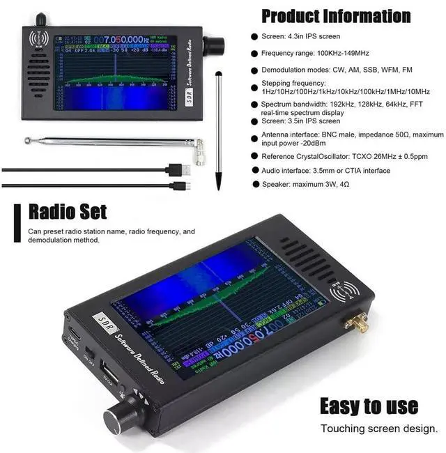 4.3 -inch IPS acitive screen for more convenient operation. ^^ Built-in 5000mA reable battery for long working time. ^^ Can preset 99 channels. ^^ Can preset radio station name, radio frequency, and demodulation method. ^^ Touching screen design, easy to use.