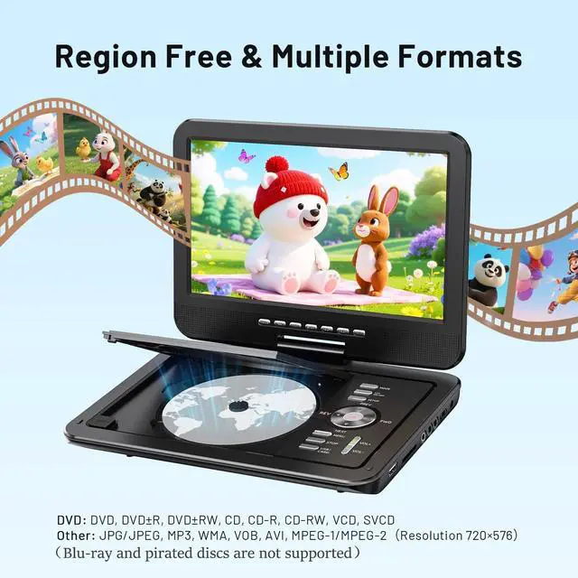 With a complete charging kit, including a 70-inch AC adapter and car charger, you'll never have to worry about running out of power during your adventures ^^ Region-Free & Multiple Formats -- The portable DVD player for car allows direct playback of DVD, DVDR, DVDRW, CD, CD-R, CD-RW, VCD and SVCD (Blu-ray and pirated discs not supported). It also supports multimedia files via USB and SD card (up to 32GB), including VOB, AVI, MP3, WMA, JPG, JPEG, MPG1/ MPG2 (resolution 720*756). The region-free design ensures seamless playback from any region ^^ Seamless Big-Screen Sync -- This portable DVD player with screen easily transforms your TV into a cinema.