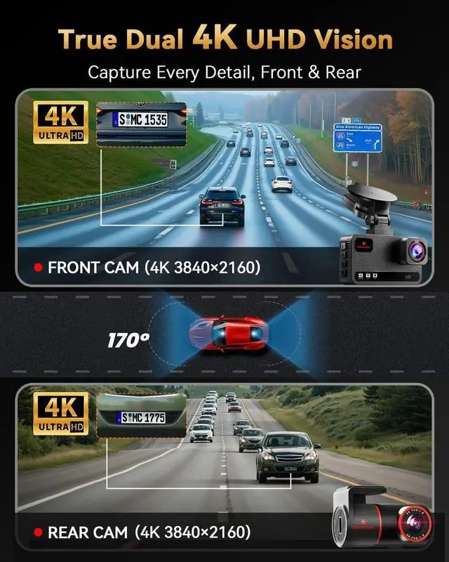 Rear Recording: The Terunsoul dash cam supports dual-channel simultaneous recording, capturing both front and rear footage. Both cameras record in 38402160P, ensuring clear footage of the road ahead and behind. The front camera features a 170 ultra-wide-angle lens, providing full coverage of six-lane roads and capturing more road details with this 4K dash cam ^^ Loop