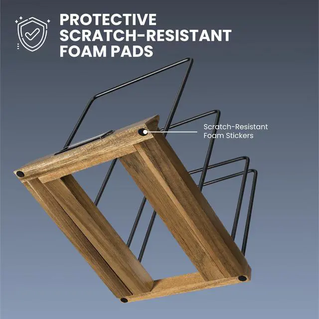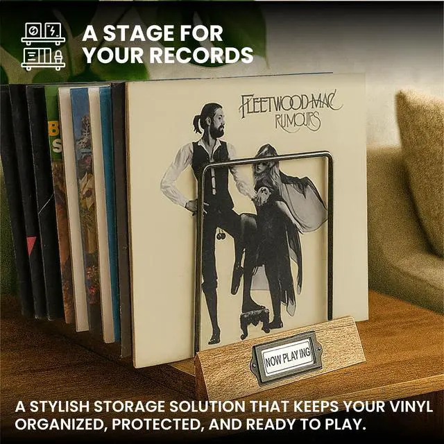 ^^ Classic And Durable: The acacia wood base of this record storage unit offers durability and a timeless look. This vinyl record holder not only showcases your collection but also enhances your decor.