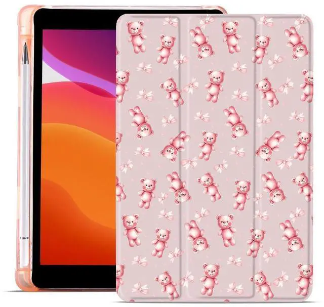 MAYCARI Original Cute Cartoon Bears Case for iPad 10.2 inch 2021/2020/2019 with Pencil Holder, Pink Heart Bows iPad 9th/8th/7th Generation Soft TPU Back Protective Cover, Auto Sleep/Wake Slim Shell